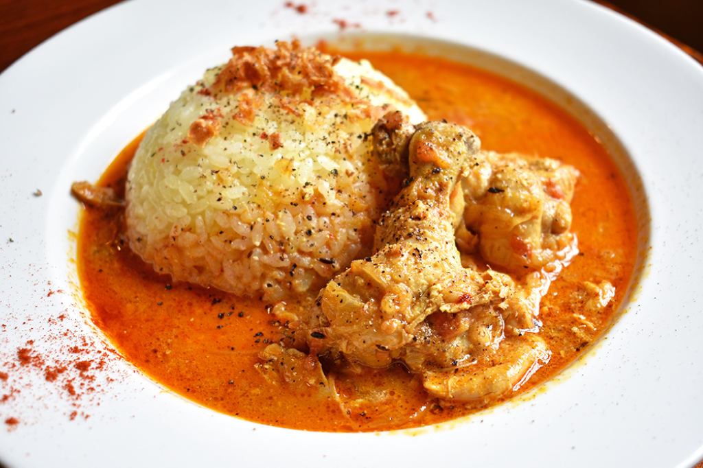 八ヶ岳産のヨーグルトと牛乳たっぷりの絶品チキンカレー。スパイシーながら、ヨーグルトと牛乳でマイルドな口当たりに。じっくり煮込んだ鶏肉はほろほろと柔らかく、濃厚さを野菜や肉の出汁が支える。北杜市産の米も美味。