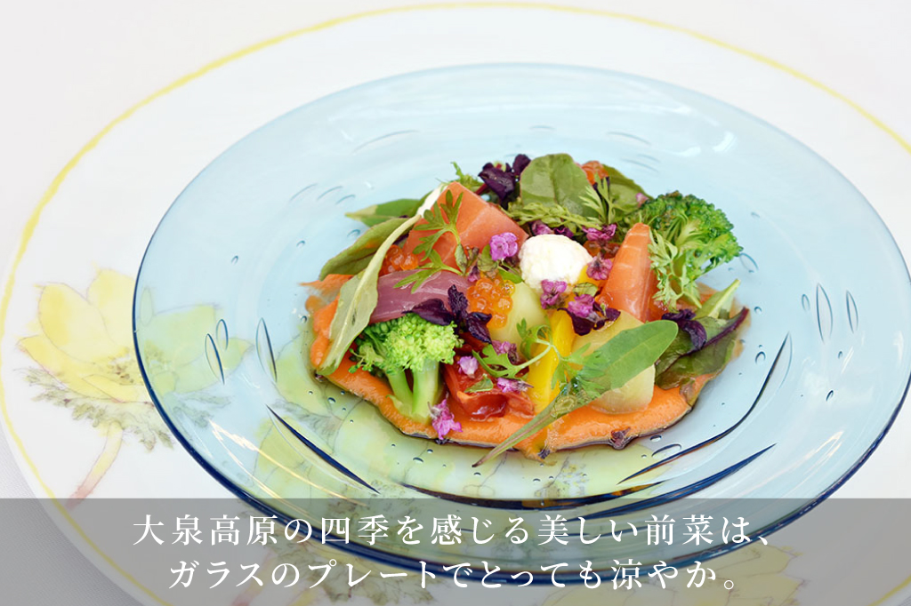季節に合わせた新鮮な地元産の食材をふんだんに使い、フレンチをベースにした見目麗しい高原料理を味わえる。八ヶ岳南麓の豊かな自然の中に佇み、上品な雰囲気でウエディングや立食・二次会・パーティなどにも人気。