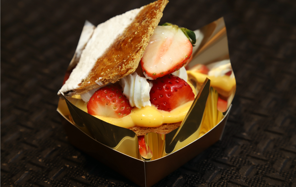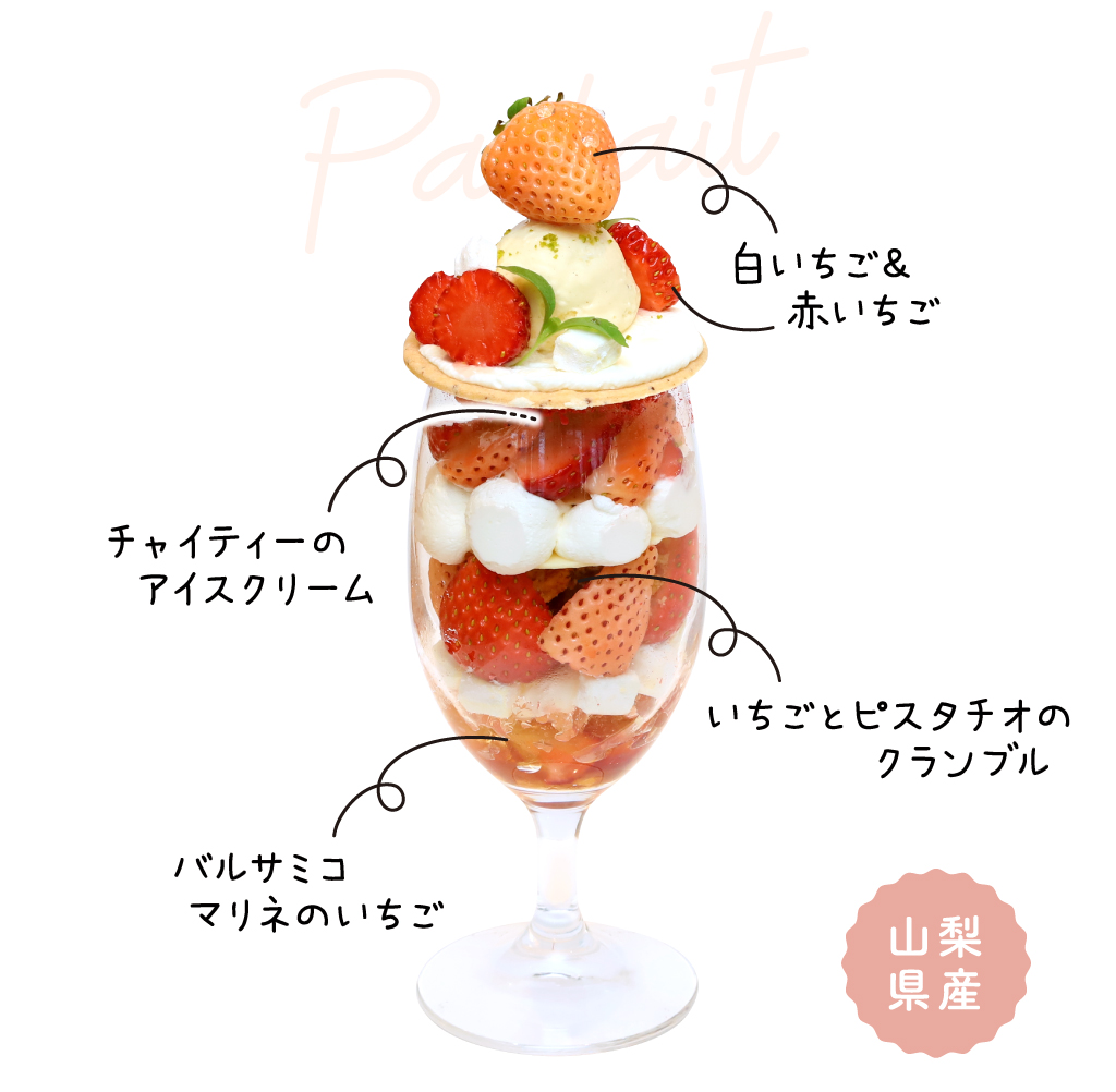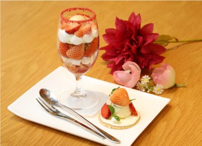 いわゆる“パフェ”とは一線を画し、パティシエの独創性溢れる大人のためのスイーツ。今春は、ピスタチオクリームの上に美しい苺の花を咲かせ、“いちごのお庭”を表現した「ジャルダンフレーズ」が登場する。それぞれの層を順番に楽しむパフェとは異なり、様々な素材の味わいが混ざり合いながら、ひとつのハーモニーとなっていく過程を楽しめるのもグラスデザートならではの醍醐味。緻密な計算のもと完成した味わいは、まさにアメイジング!