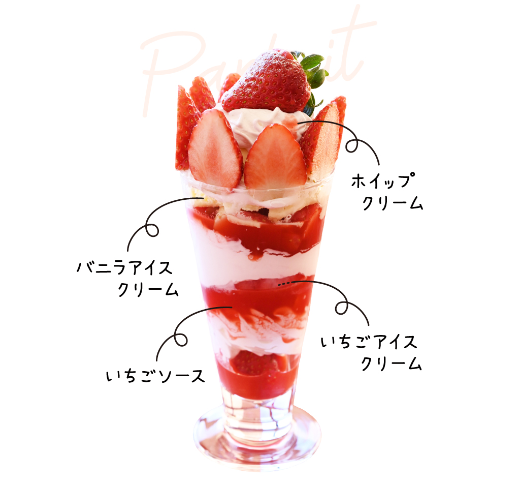 ほかのスイーツにはないパフェの究極の醍醐味といえば、やっぱり「順番」!どんな素材がどんな順番で入っているのかはとっても重要だ。次々と口の中で移り変わっていく食感や味わい、余韻を楽しめる。ホテルシェフが様々な組み合わせや順番を試してベストな層を見い出したベラヴィスタのいちごパフェは、2種類のアイスクリームといちごの調和に注目したい。最初は生いちご×バニラ、中間層はカットいちご×苺アイスで舌を夢中にさせる。