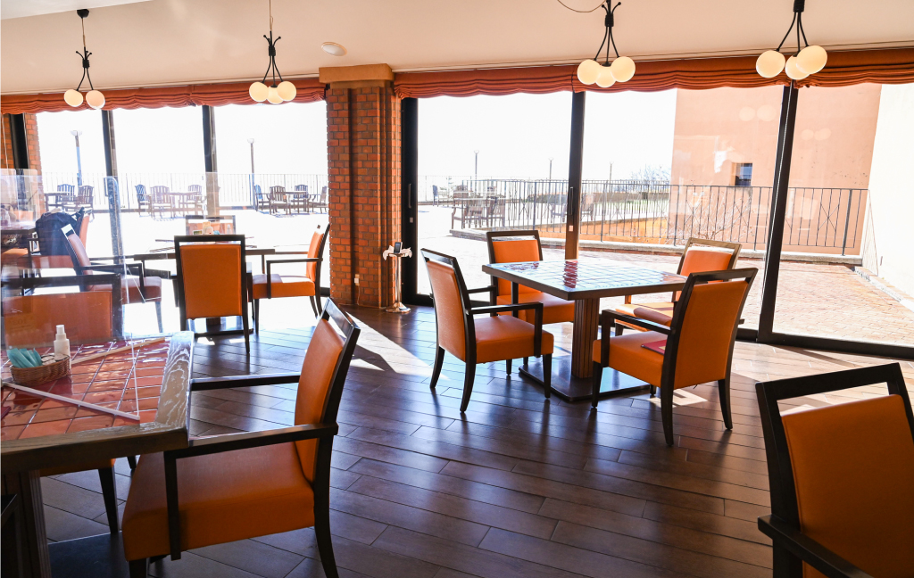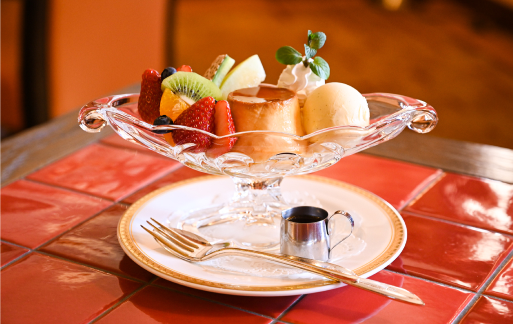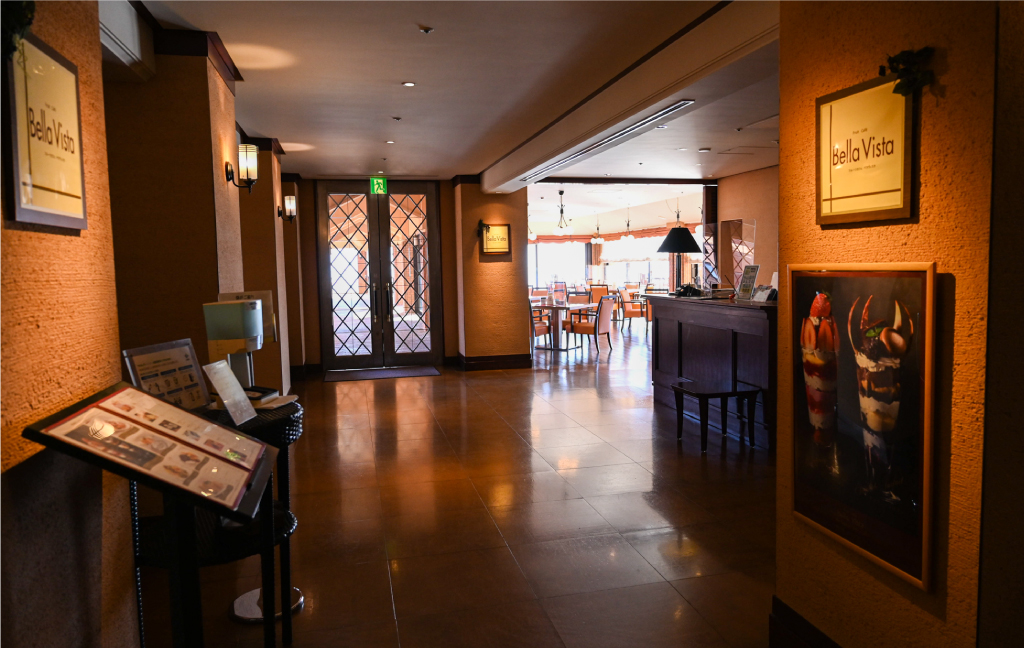 絶景が広がるフルーツパーク富士屋ホテル1階ラウンジにある「フルーツカフェ ベラヴィスタ」。大きな窓からはテラスを一望、陽光溢れる心地いい空間が広がる。旬の果物をたっぷり使ったパフェのほか、ホテルメイドの軽食も大評判。
