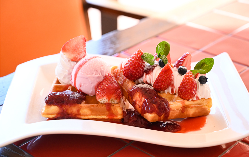 いちご、ホイップクリーム、アイスクリームをひとつに繋ぎ合わせるのが、ホームメイドのストロベリーソースだ。甘さ控えめでシンプルだからこそ、いちごのフレッシュさが存分に味わえる。旬のいちごは産地にはこだわらず、その時々の一番おいしい品種で構成する。