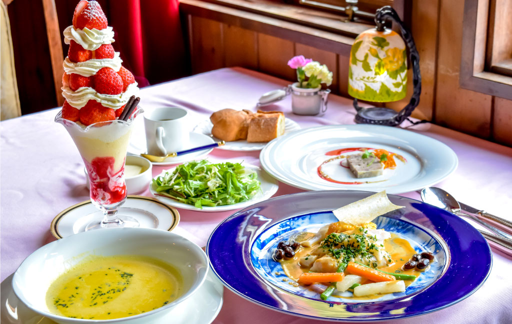 開国橋すぐの老舗フレンチレストラン。地元食材をメインに、手間暇惜しまず手作りする料理はどれも絶品なのに、とってもリーズナブル。ヨーロッパのアンティーク家具で揃えたモダンな雰囲気の店内で本格的フレンチといちごスイーツを楽しもう。