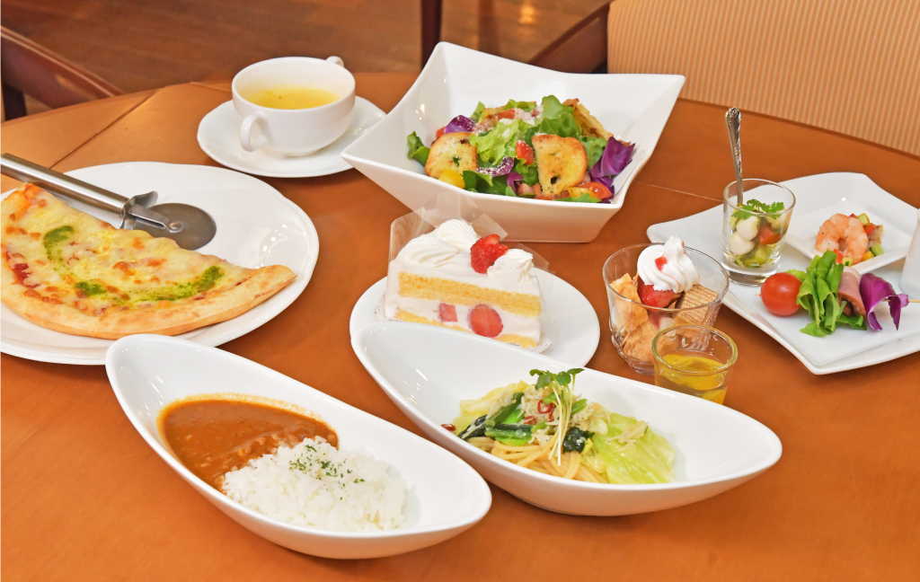 アフタヌーンティーの王道アイテムははずさず、シャトレーゼ運営ならではの醍醐味も!定番から季節の生ケーキをショーケースから選べ、下段にはグラスデザートと自慢の焼き菓子が並ぶ。
