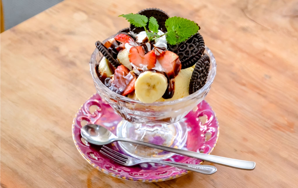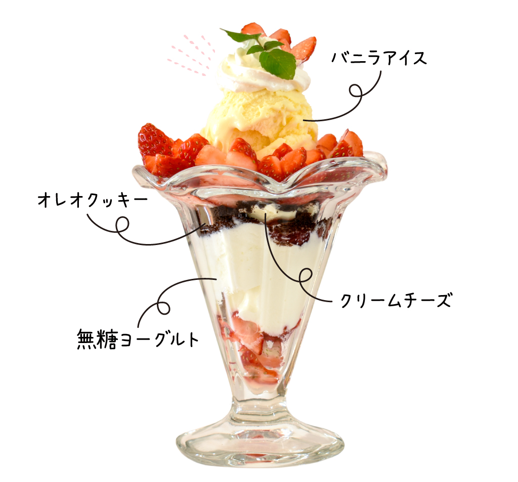 甲府市にある農家から直接仕入れた摘みたていちごの大人気パルフェが今年も登場!バニラアイスクリームやヨーグルト、いちごジャムなど、バランスのとれた配置で軽やかに食べられるとリピーターからも大好評だ。センターにドーンと構えるバニラアイスの周りに散りばめられた真っ赤ないちごは、なんとハート型に♡仕掛けられたいちごの甘い罠にプラスして、ほろ苦いオレオの大人な味わいにもう釘付け!可愛いだけでなく、最後までもたれずに食べられるのも人気の秘密。