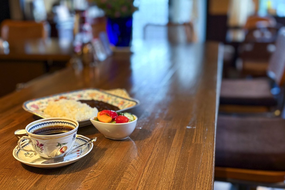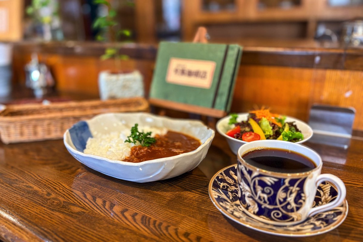 身延山久遠寺から下っていくとある、150年続く旅館 山田屋に併設された昔ながらの喫茶店。マスターが若い頃、旅したインドで魅了された味を再現したカレーと、京都の名店「イノダ」のブレンドコーヒーが看板だ。