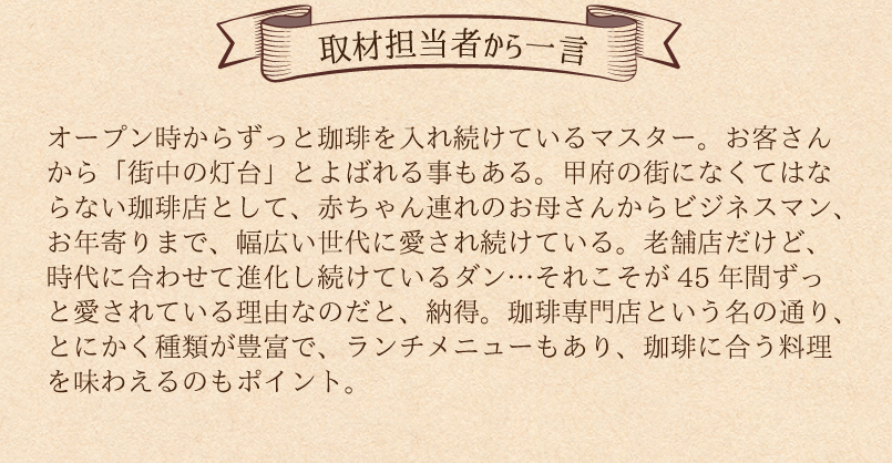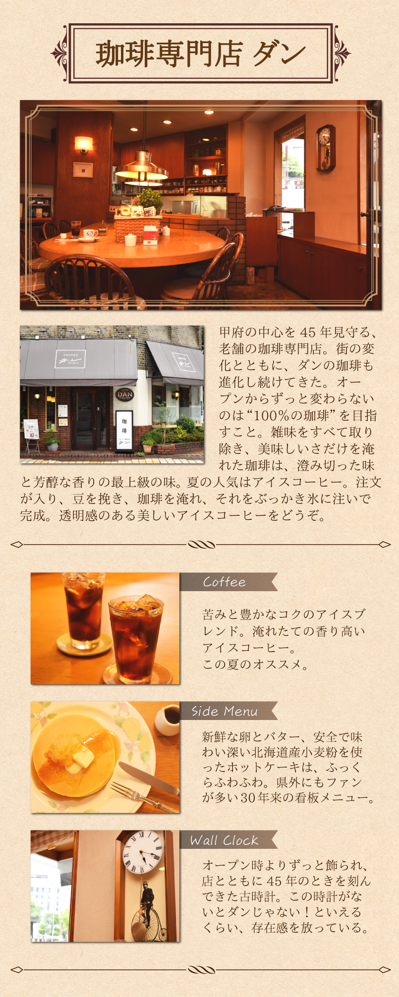 約50年以上続く老舗喫茶店「ダン珈琲店」。甲府市役所や山梨県庁が近い好立地にあることから、サラリーマンや地元客の憩いの場として愛される。オープンからお店に立ち続けるマスターの、心安らぐ渾身の一杯をご堪能あれ。