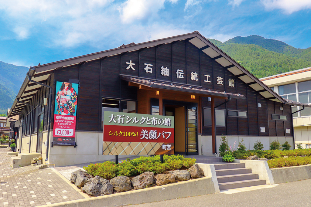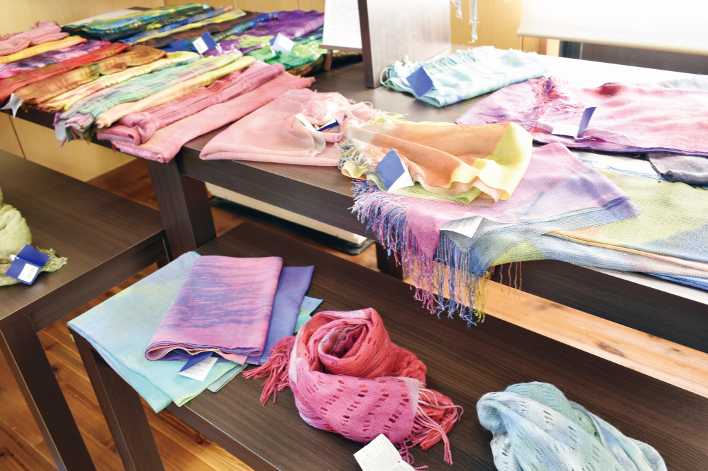 河口湖で江戸時代から続く「大石紬」で作った商品の販売や体験教室を行う伝統工芸館。