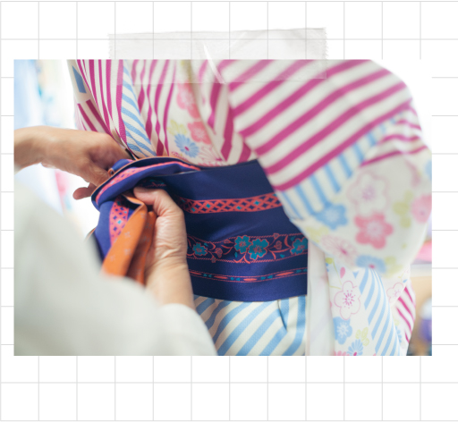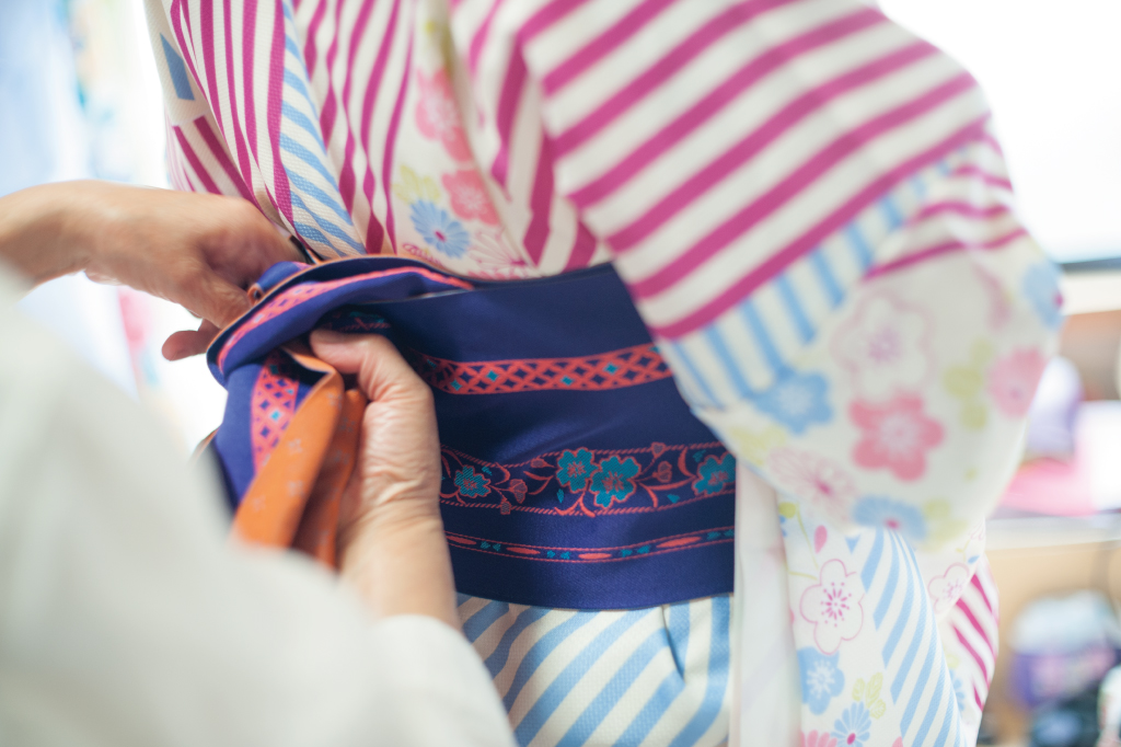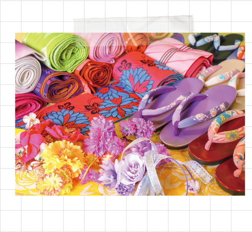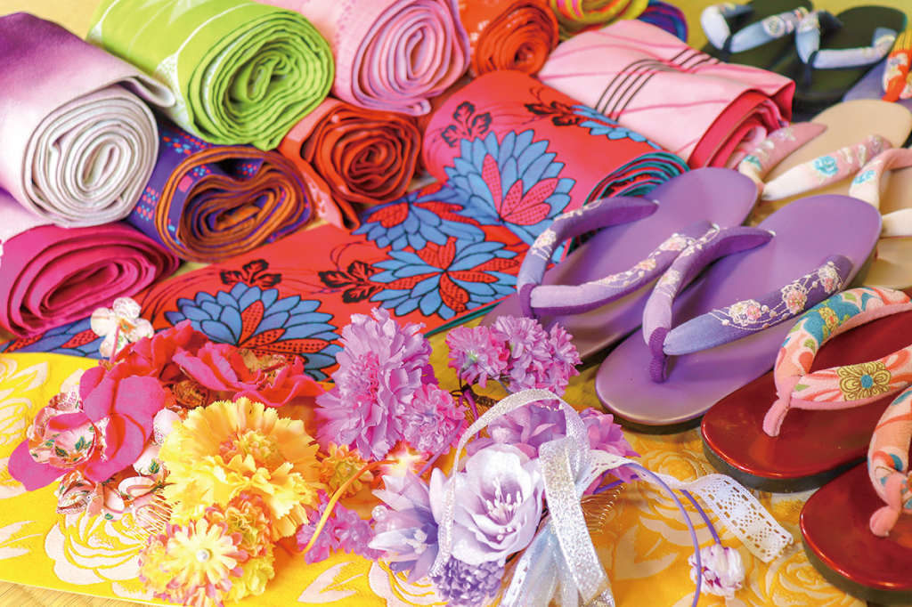 その中にある着物レンタルサービスで、カラフルで種類豊富な着物や帯、髪飾り、草履、巾着をそれぞれ好みでチョイスできる。