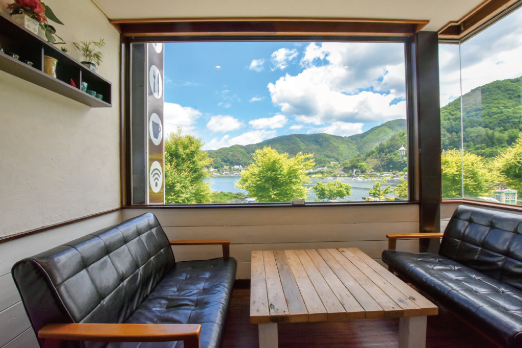 3階はテーブル席とコンセント付きのカウンターテーブルで、河口湖の眺望を楽しめる。