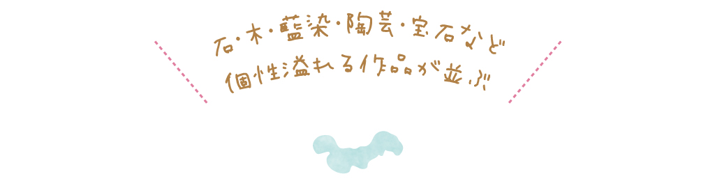 石・木・藍染・陶芸・宝石など5名のアーティストを中心に、お手頃価格のものから1点ものまでが揃う。