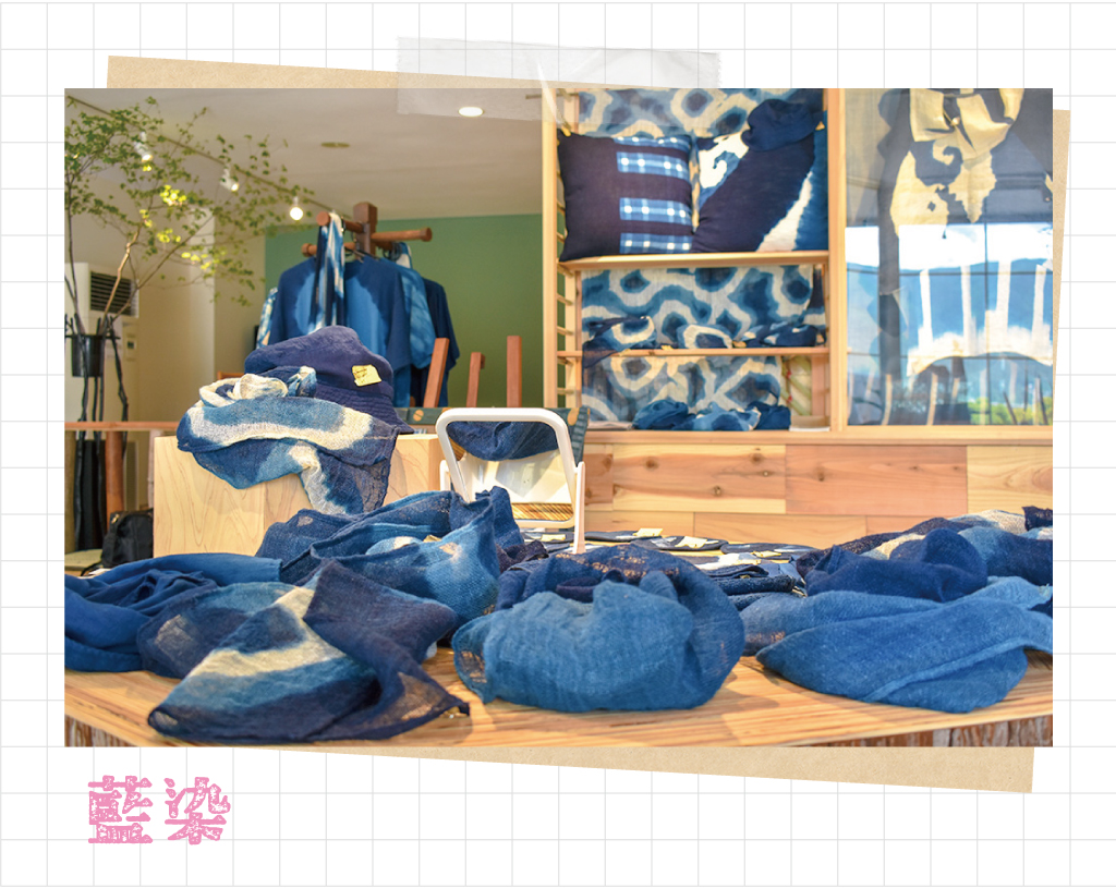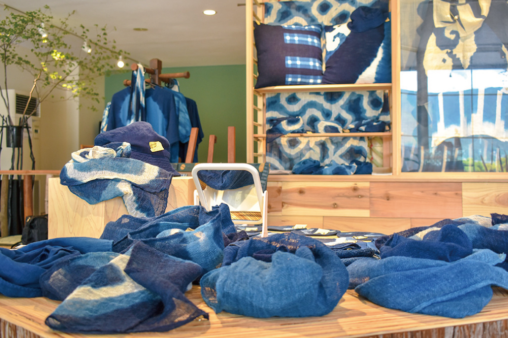 都留市出身の藍染アーティスト、佐藤さんの作品。オーガニックの素材を使い、体に優しく、シャープさとしなやかさを兼ね備えた紋様が美しい。