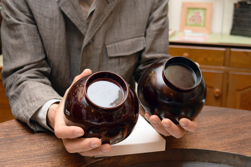 新品の漆器のお椀と、普段保坂さんが使っているお椀を見せていただきました。