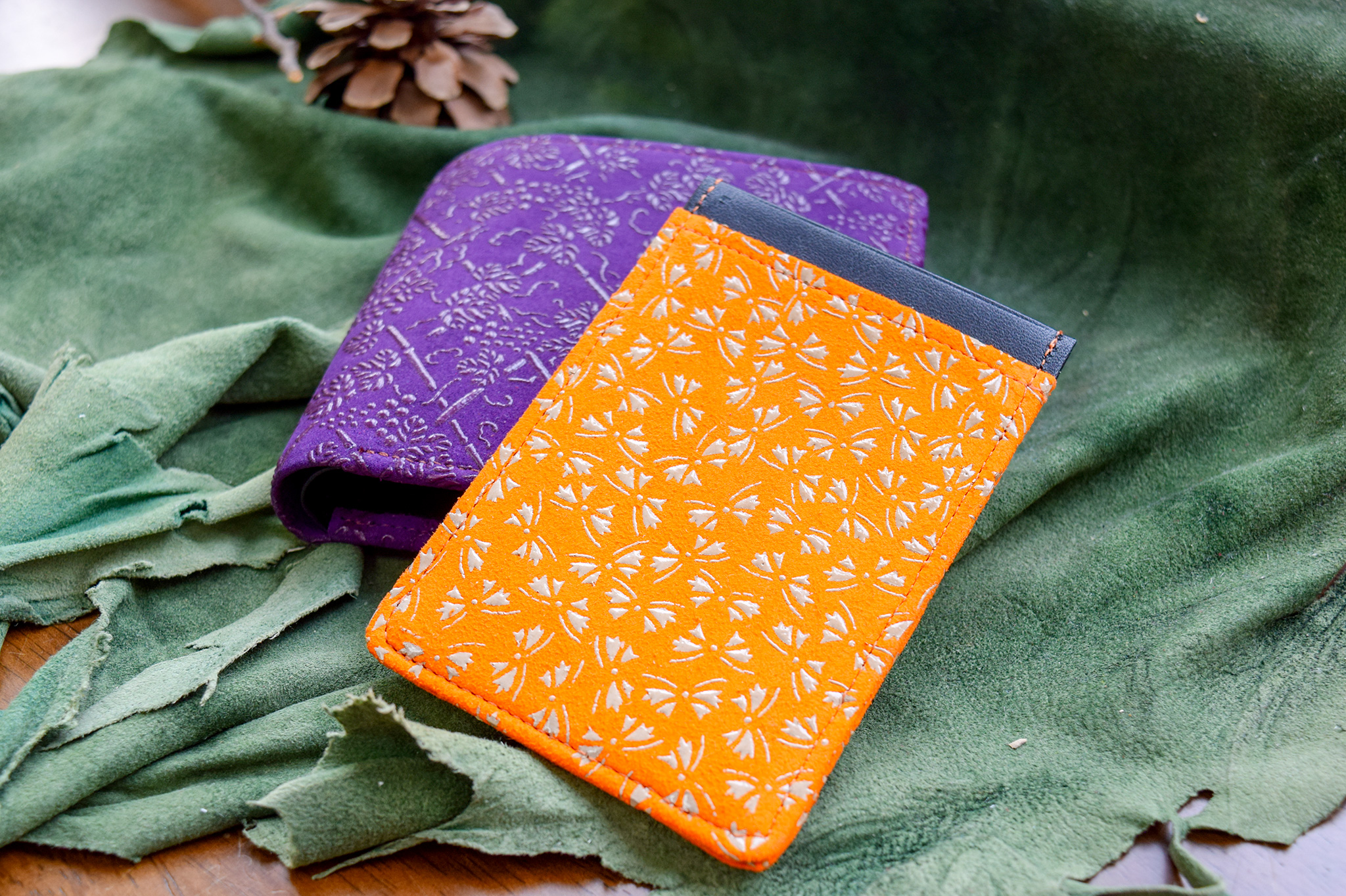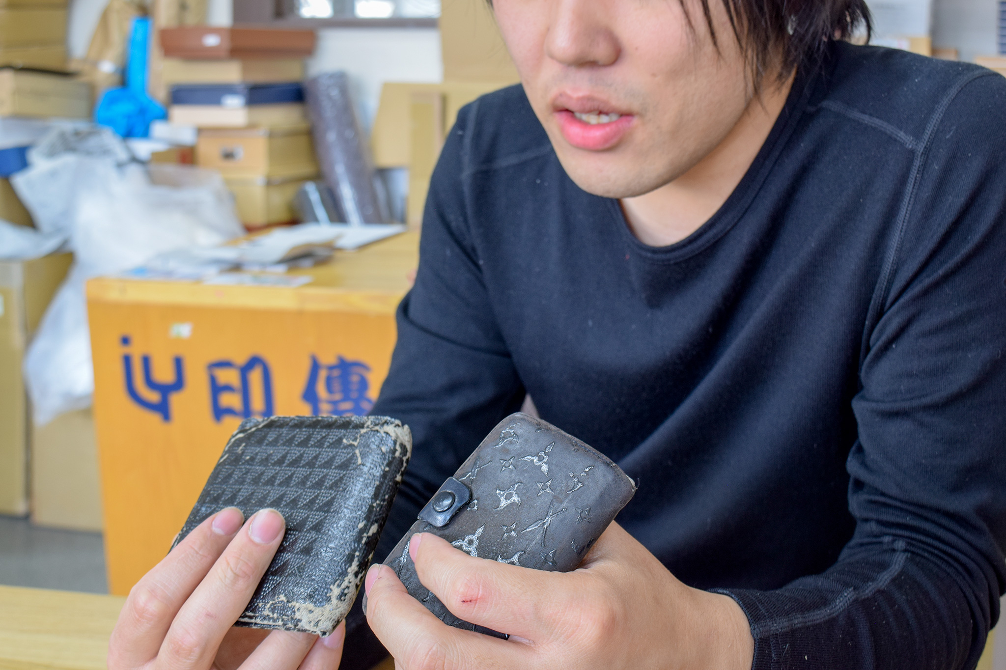 もうひとつは、通常染め上げた鹿革に漆で模様付けを行うのですが、漆で革を染め上げてコーディングするという現代では廃れてしまった技法でつくった財布。