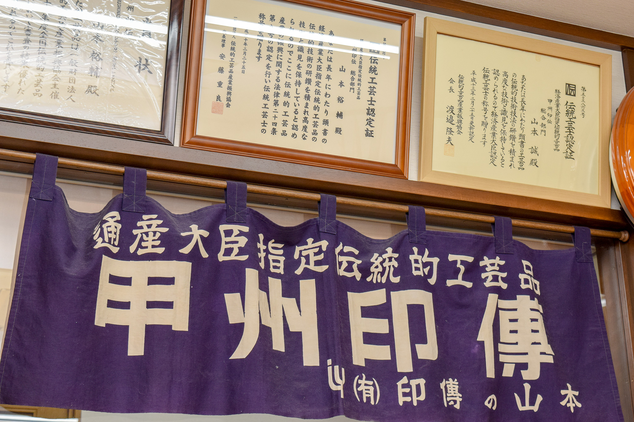 江戸時代に始まったという、やわらかい鹿革に漆で模様付けした革工芸の灯火は、第二次世界大戦の波に飲み込まれ、いったん消えかけましたが、戦後に再び甲府で「山本商店」として製作を復活。