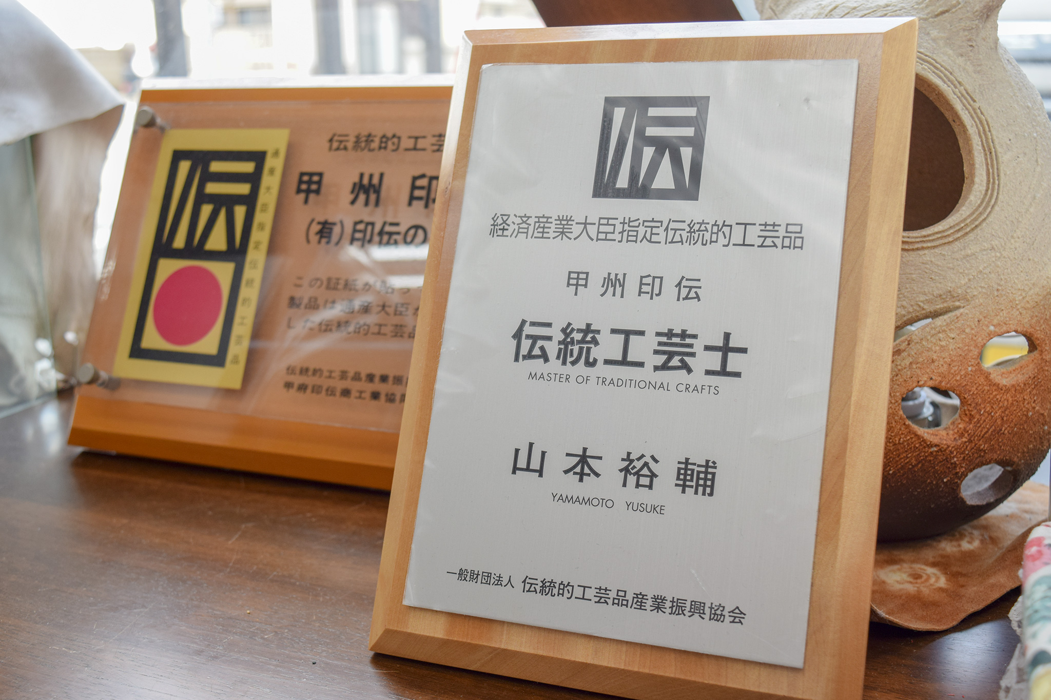 「中学生の頃、父がもらってきた伝統工芸士の盾を見て、“あ、これ俺も欲しい”って思ったんです。なんだろう、書体とか素直にかっこいいなって…。これもらうために、印伝職人になるんだって決めました(笑)」。