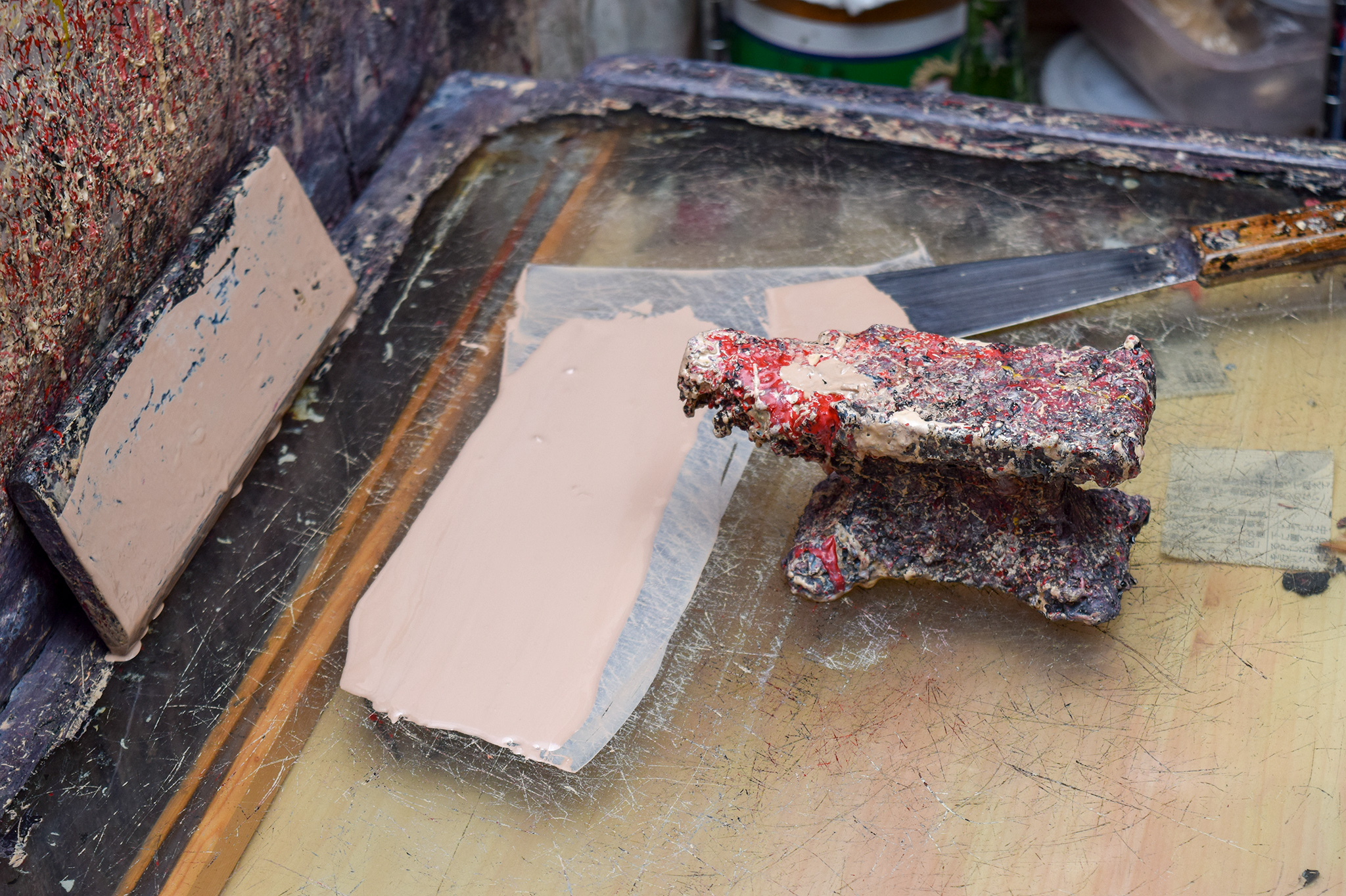 鹿革に型紙を乗せ、漆を均等にヘラで盛り付けていく作業をひたすら毎日練習。最初は小さな革からスタートし、100%失敗しなくなったら、少しずつ革を大きくする…これを約5年繰り返し、やっと一人前に。