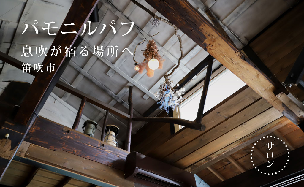 築150年の民家をセルフビルドし、カフェと美容室を融合させたお店。洗練されたこだわりの空間には、幅広い世代が来店する。美容室のほか、衣服の展示販売会や雑貨の販売、そのほかミュージックビデオの撮影など、多岐にわたって利用する人の多いパモニルパフはまさに、人と人とが繋がっていくサロンのような場所。