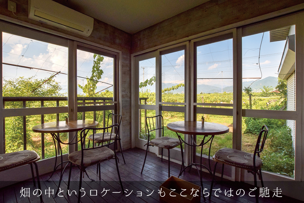 桃の里、一宮に広がる緑豊かな果樹農園「大北農園」。畑の中には、静かな時間を刻む隠れ家カフェが。