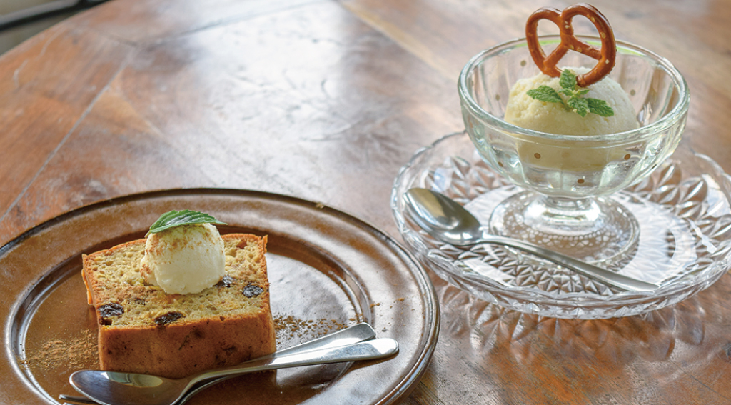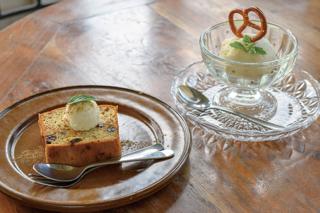 パウンドケーキアイスクリームのせやもも・ぶどうのアイス(各420円)など。