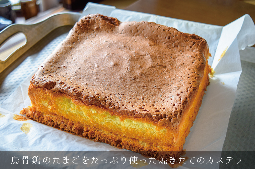 外で飼っている烏骨鶏の卵を使用したカステラが自慢。
