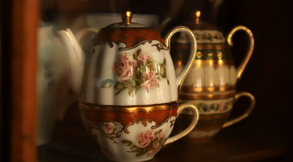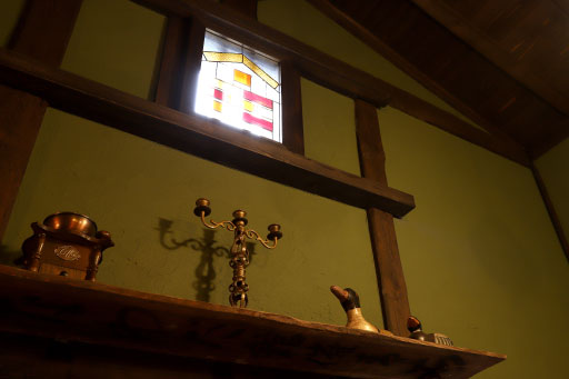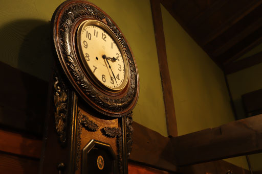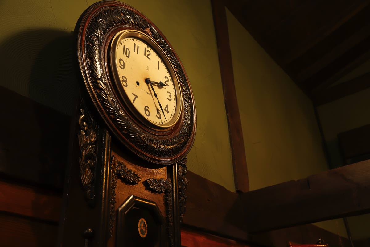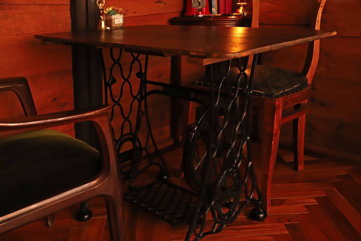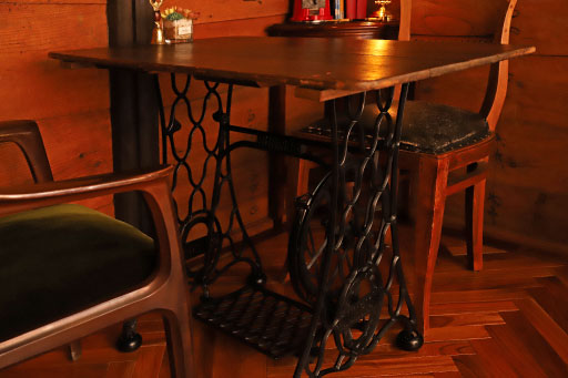 古いミシン台を活用したテーブルや、今も変わらずに時を刻む100年の古時計など、愛すべきアンティークで溢れている。