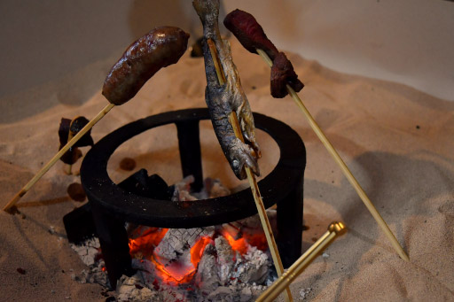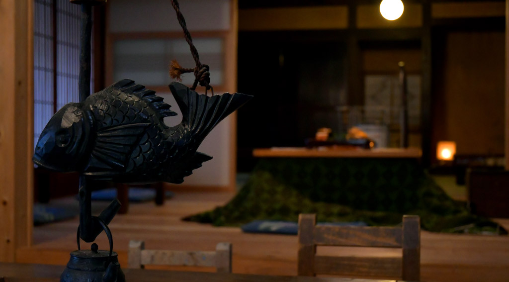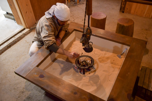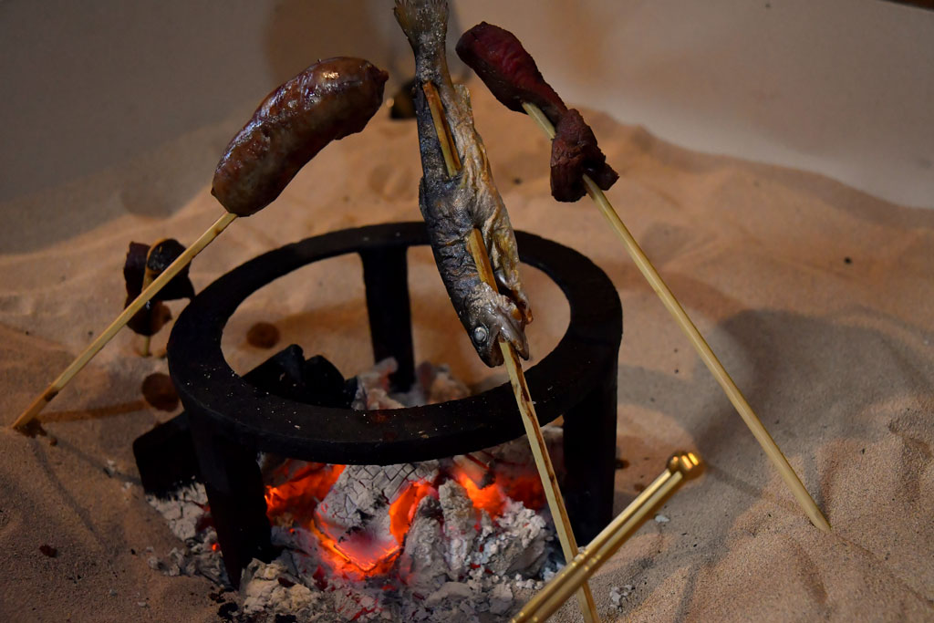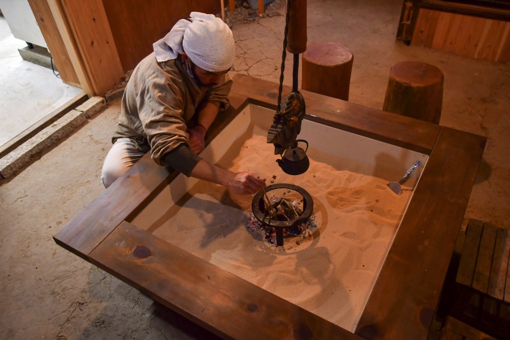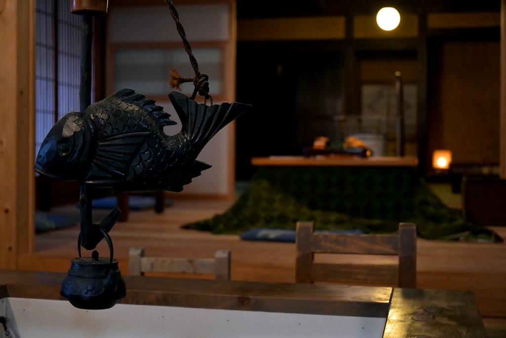 囲炉裏でジビエやヤマメ、原木椎茸などを焼いて、ほっこりと風情あるくつろぎの時間を満喫。