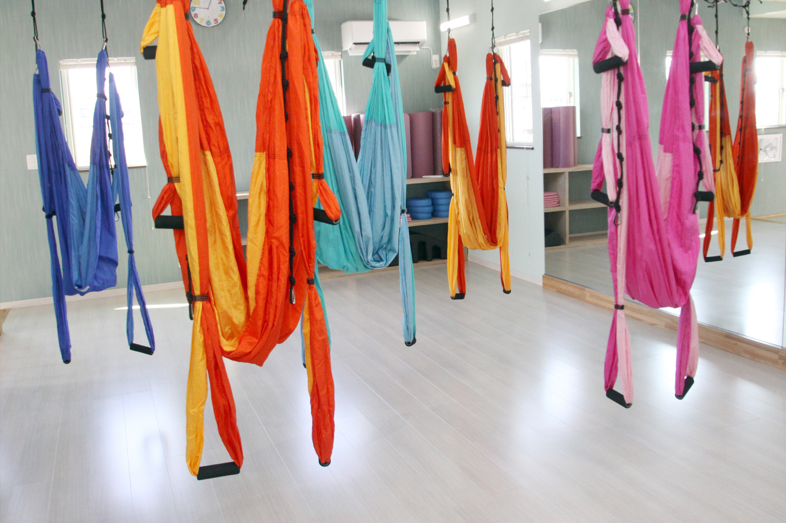 天井から吊るされたシルクサスペンション™や、伸縮性のある特殊な幅広い布を使ったstretch-eze®など、ここならではのプログラムが。年齢や性別に関係なく、トライできそう!
