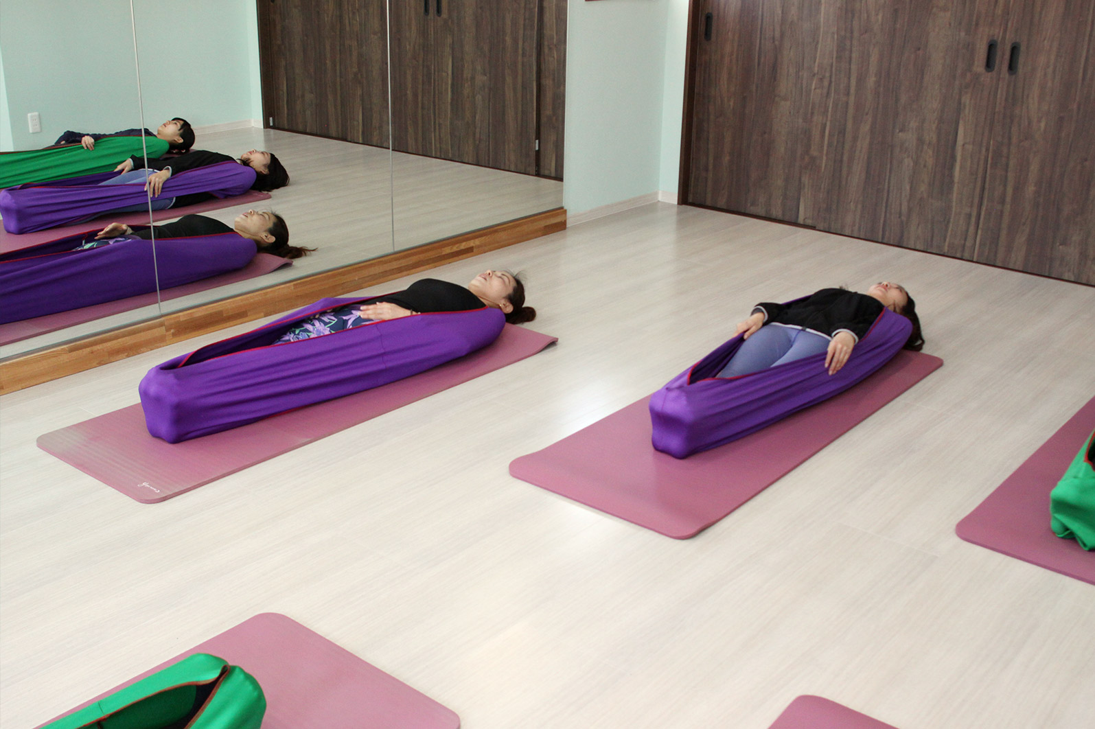 天井に吊るされたハンモック状の布とストラップを使ってエクササイズ。呼吸とともに身体をコントロール。見た目の華やかさに反して、身体をしっかりと動かすことができて本格的!次第に身体が目覚めていく感覚が!