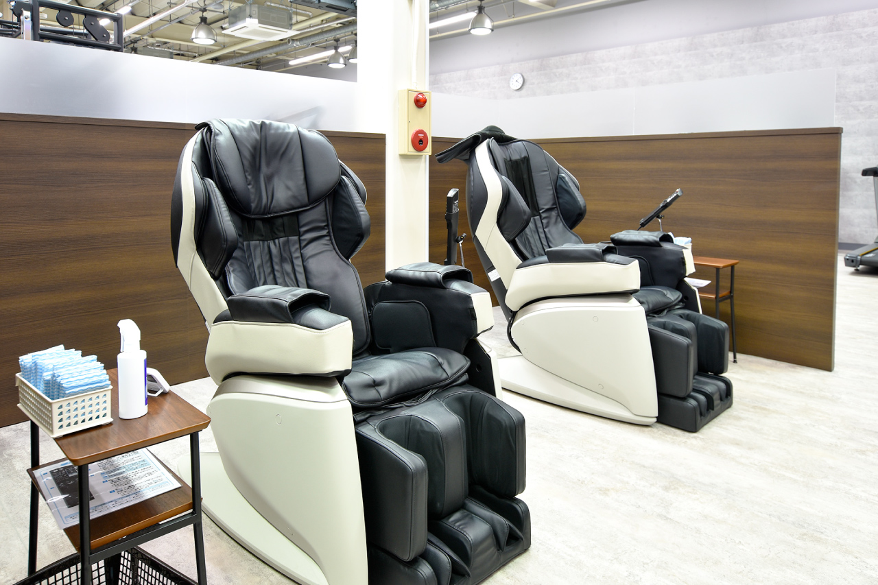 ストレッチエリア、無料ロッカー、飲料自動販売機、高精度体成分分析装置、館内Wi-Fi設備、マッサージチェア2台、契約ロッカー(1,000円/月※税抜)、水素水飲み放題(1,000円/月※税抜)