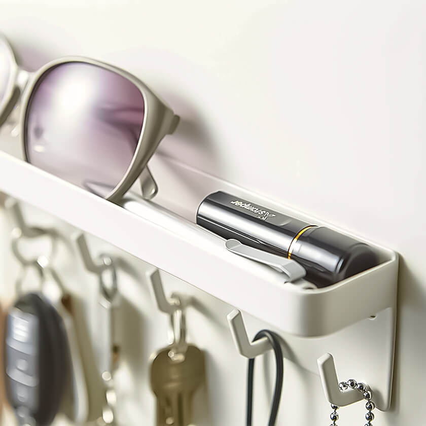 家を出るとき、鍵がないと慌てることもなく、家に帰ってきたら、ぽいっとどこかに置き忘れることもない。もう鍵の定位置はここ。トレイの上には印鑑やペンなど、宅配時の小物たちを。