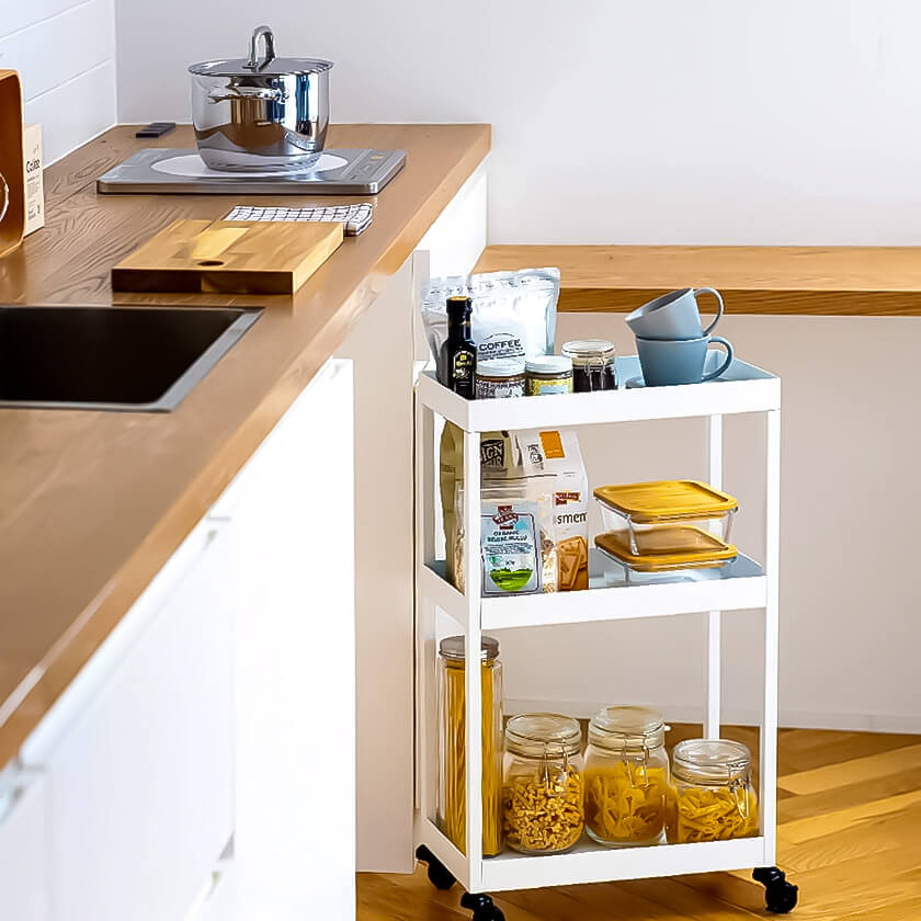 私に合わせて動く棚。料理中のキッチンはどんなに広い場所でも散らかるもの。スタメンの調味料から、よく使うストックアイテムは、どこにもしまわずに取り出しやすいワゴンへ。