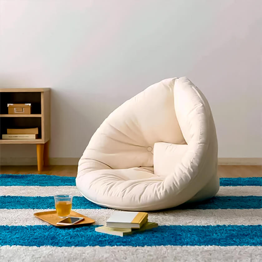 包まれるように、すっぽりと座れば、収まりの良さにうっとり。お家のどこでも、外にだって持ち運べるソファ。広げると半月のラグにも。
