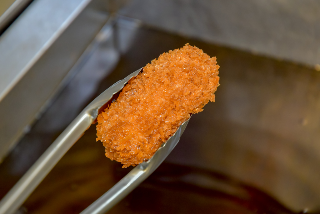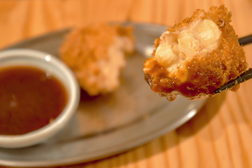 粗めのパン粉に包まれたコロッケには紅ズワイガニのむき身を使用し、大山の濃厚な牛乳でとろみをつけたベシャメルソースをたっぷりと混ぜ合わせる。オーダーごとに揚げるため、常にアツアツの美味しい状態で食べられるのが魅力の1つ。