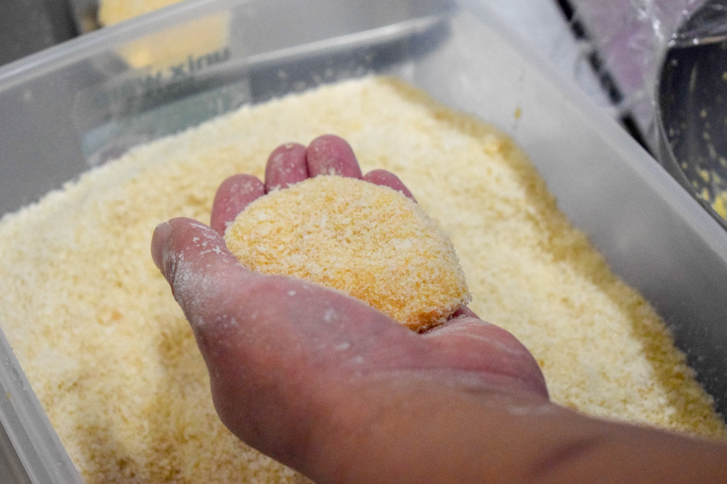 きめ細かいパン粉を使うことで、余分な油を吸うことなく、サクッと繊細な歯ざわりが可能になるそう。