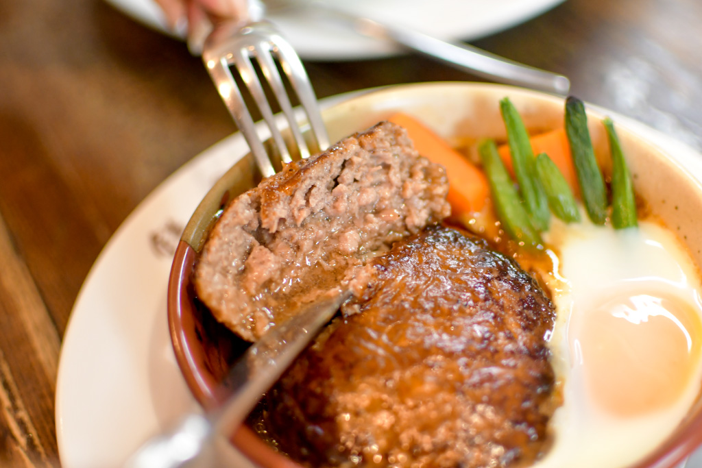 特製デミグラスソースに包まれた煮込みハンバーグをひと口食べれば、もう肉汁が止まらない‼さらにお肉の柔らかさにビックリ!