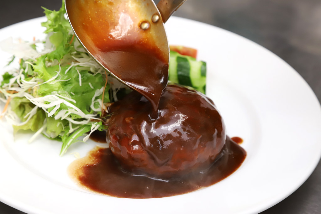 名古屋出身のシェフの作る八丁味噌、デミグラス、おろし、どのソースも絶品で、やわらかくてジューシーで旨味たっぷりのハンバーグは、これぞお店の味!です。