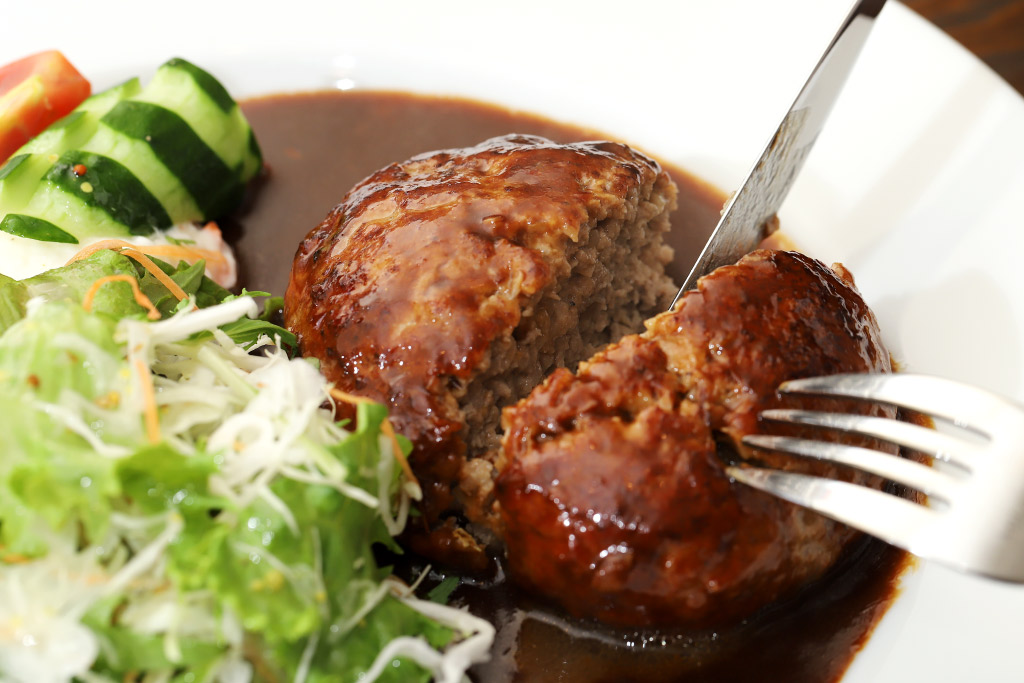 本場、名古屋仕込みの八丁味噌を使ったソースの煮込みハンバーグ。名古屋でもなかなかお目にかかれないという超オリジナルの逸品は、これは食べてみないことにはわからな~い‼