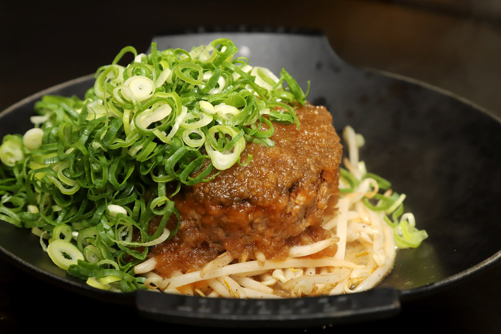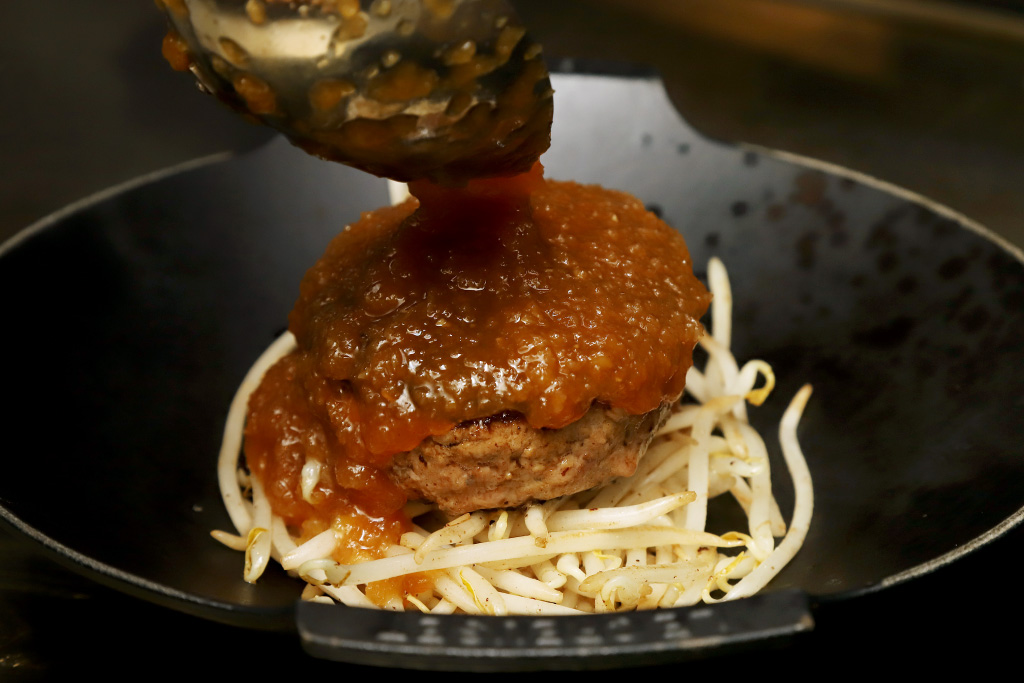 熱々の鉄板の上で、肉塊がジュウ~っと、丁寧にじっくりと焼き付けられていく。仕上げはバターでコクと旨味をさらにプラス。肉縮み一切なしのふっくらやわらか~いレアハンバーグを頬張れは、口の中は肉汁の海に‼