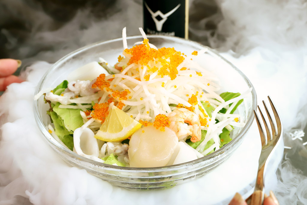 ランチタイムは、全品名物サラダ付き!この美しい演出には思わず歓声が!みずみずしい野菜たっぷりの贅沢な副菜に感激間違いナシ。複雑な旨味が凝縮されたオリジナルドレッシングでいただけば、野菜の甘みと共に、舌にまろやかに染み入る。