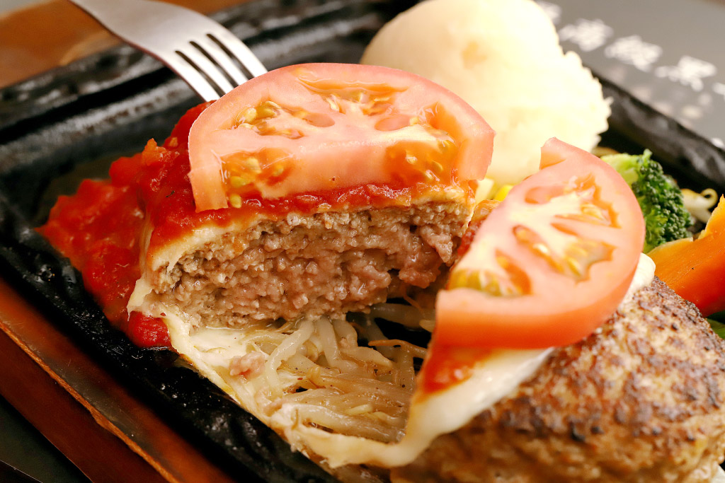 主役のハンバーグは、アツアツ鉄板の上でふっくらと鎮座。自家製トマトソースととろ~りチーズに包まれ、噛むほどに旨味が増す。中心部に赤みを残し溢れ出る甘みのある肉汁、トマトの爽やかな酸味、濃厚かつクリーミーなチーズ…この上なく贅沢なひと時に酔いしれよう。