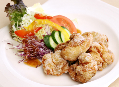 にんにくがしっかり効いたジューシーな唐揚げ。ひとつひとつが大振りで食べ応えも抜群。 -