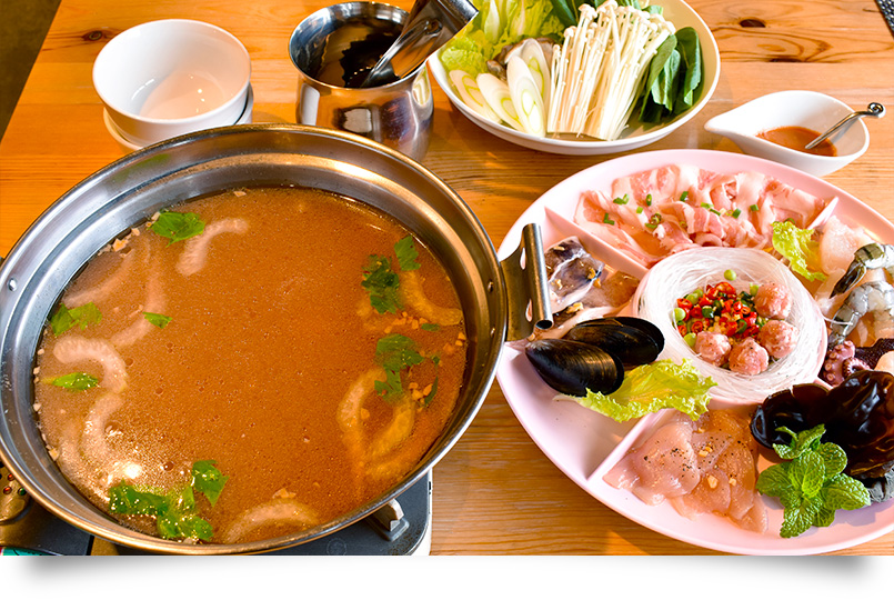 色とりどりの具材は見た目も鮮やかで、インスタ映えも!しゃぶしゃぶしたら、ピリ辛のタイすきソースでどうぞ。