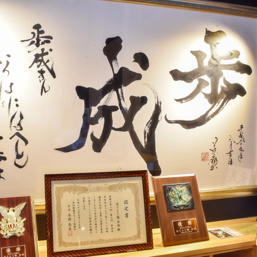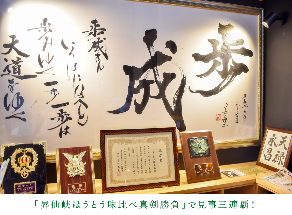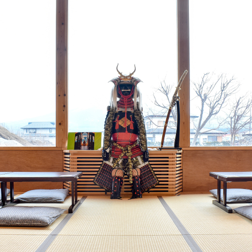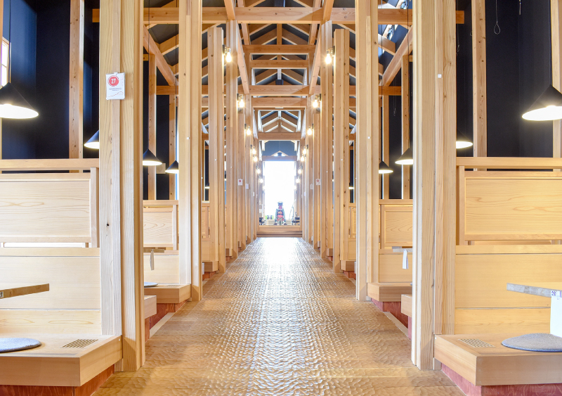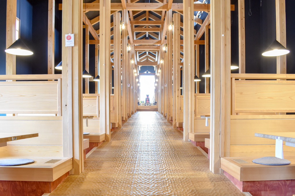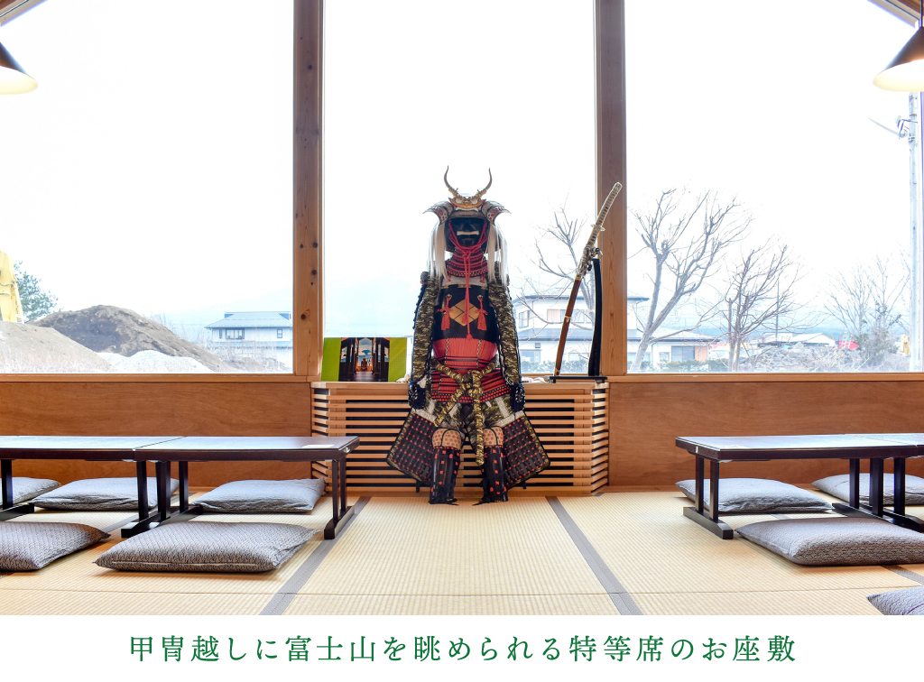 入口からガラス張りの通路を抜け、靴を脱ぐと両側にベンチシートの座席が並び、真ん中にはゆるやかな上り傾斜の木の床が奥へと続く。目の前には甲冑をつけた武田信玄の姿が!?甲冑越しにそびえる美しい富士山とのコラボレーションもお見事!こんな唯一無二の空間でいただく黄金ほうとうは、また格別の味わいで染み渡る。