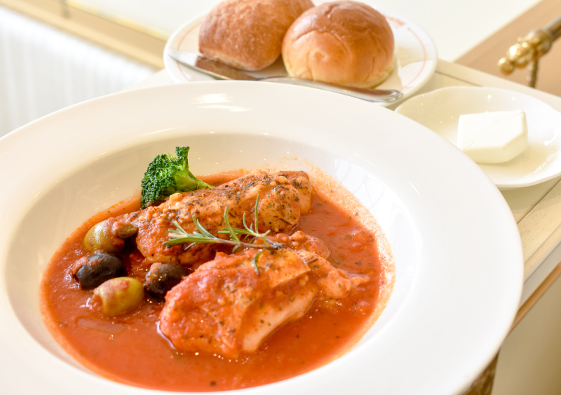ホテルシェフによるチキンのトマト煮込み。イタリア産の完熟トマトがたっぷり、ワインにも。