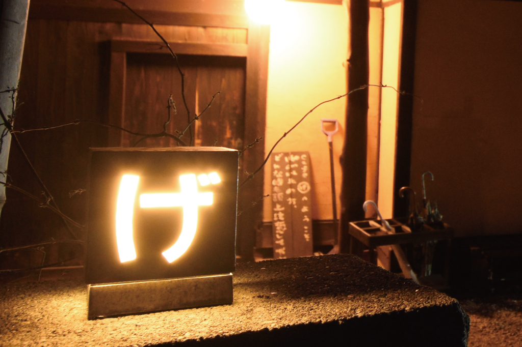 韮崎市の穴山、細い道を入っていくと暗闇の中「げ」の文字が浮かび上がる。
