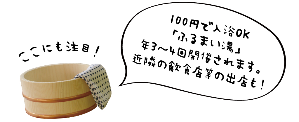 - 内湯、霊湯、シャワー1個(ただし沸かしていない源泉なので28℃と非常にぬるい)、カラン2個、湯上り処、カフェ、宿泊施設