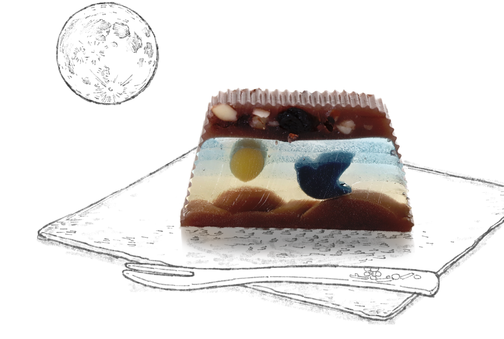 <fly me to the moon>…開けた瞬間から心奪われる。三日月から徐々に満ちる月へと青い鳥が羽ばたき、夜の帳が下りて…。小豆羊羹の山並みにシャンパンBRUT錦玉羹の空、月と鳥はレモン羊羹。その上に会津産鬼クルミ、クランベリー、レーズンの小豆羊羹が重なる、洋と和の素材を見事にコラボさせた芸術品。