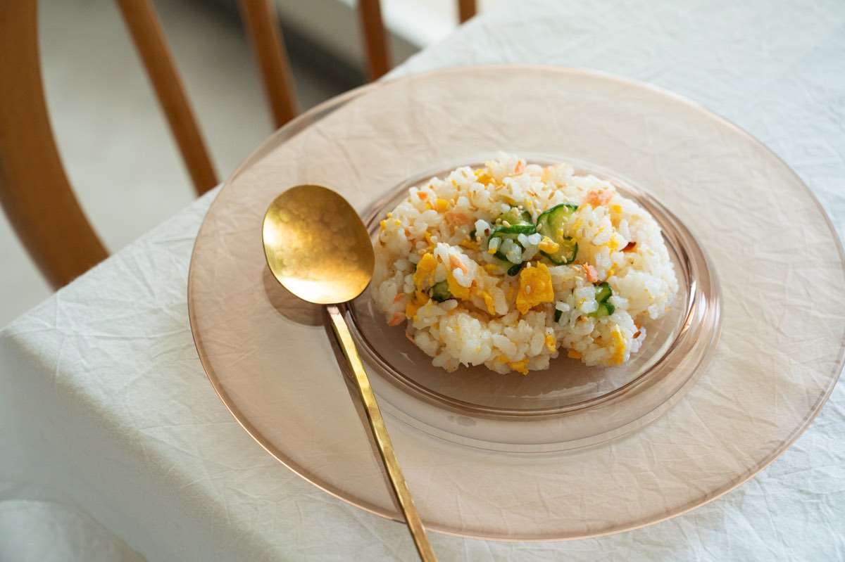 一見華奢に見えるけど、あたるところには適度な厚みがあったりと、意外に実用的なのがこのガラスプレートのいいところ。サラダやおつまみはもちろん、ちらし寿司やチャーハンなどのご飯ものにもよく合う。