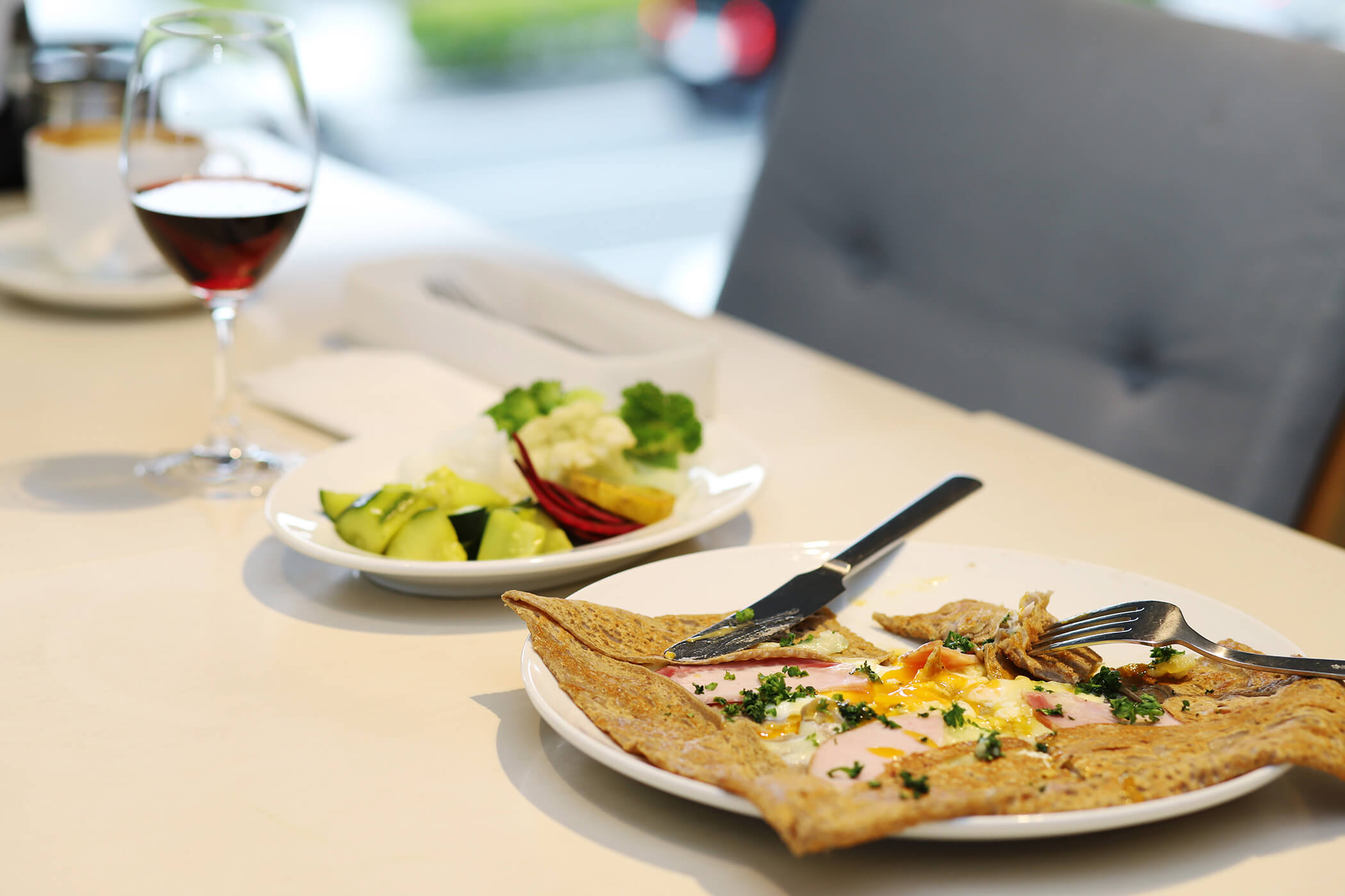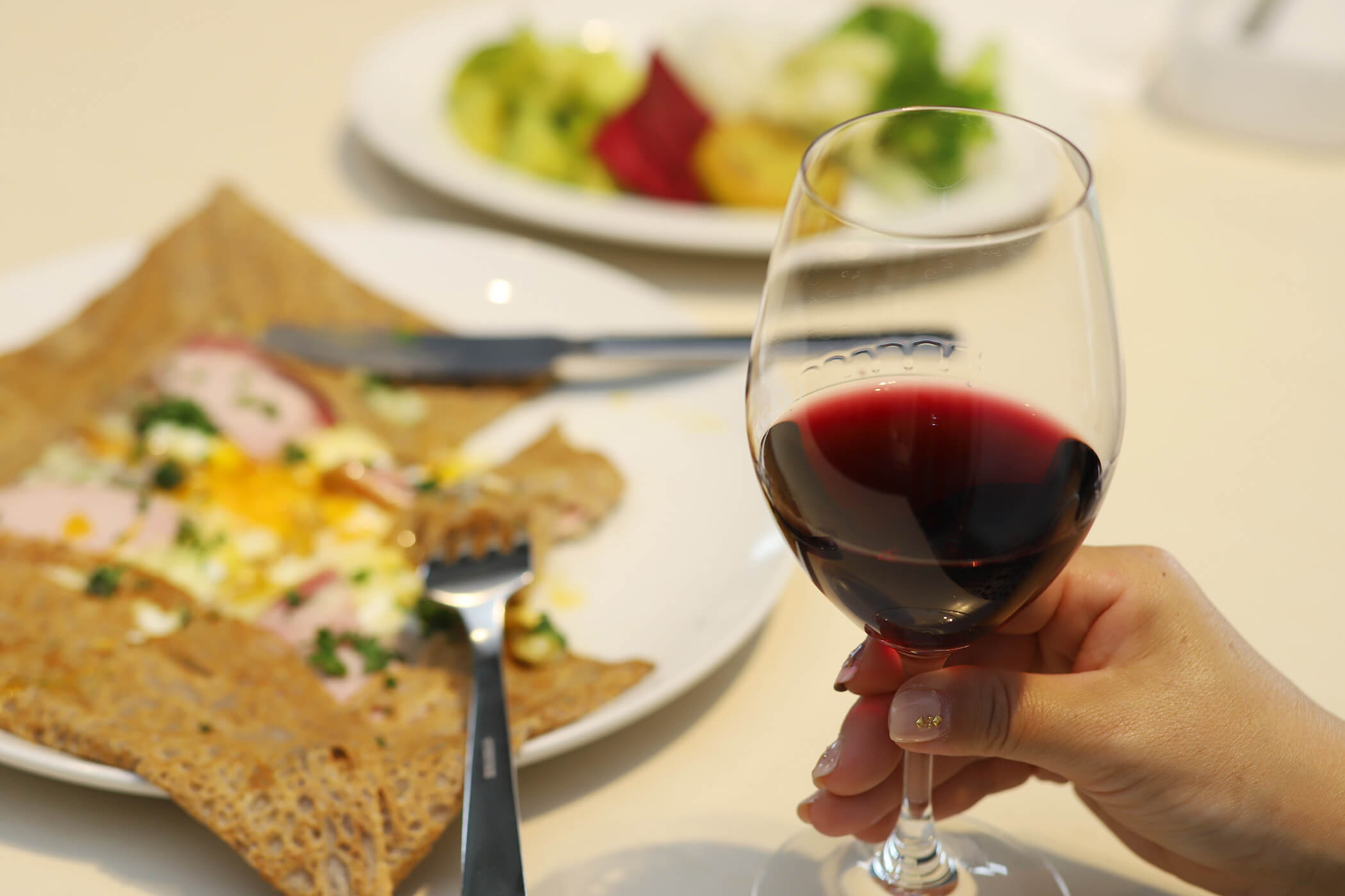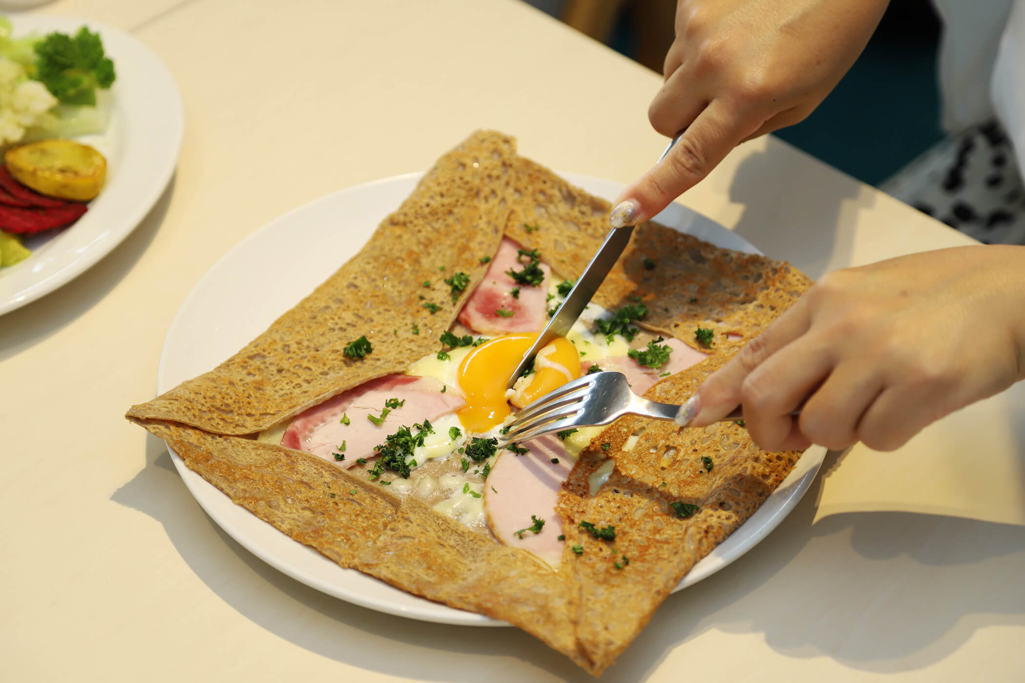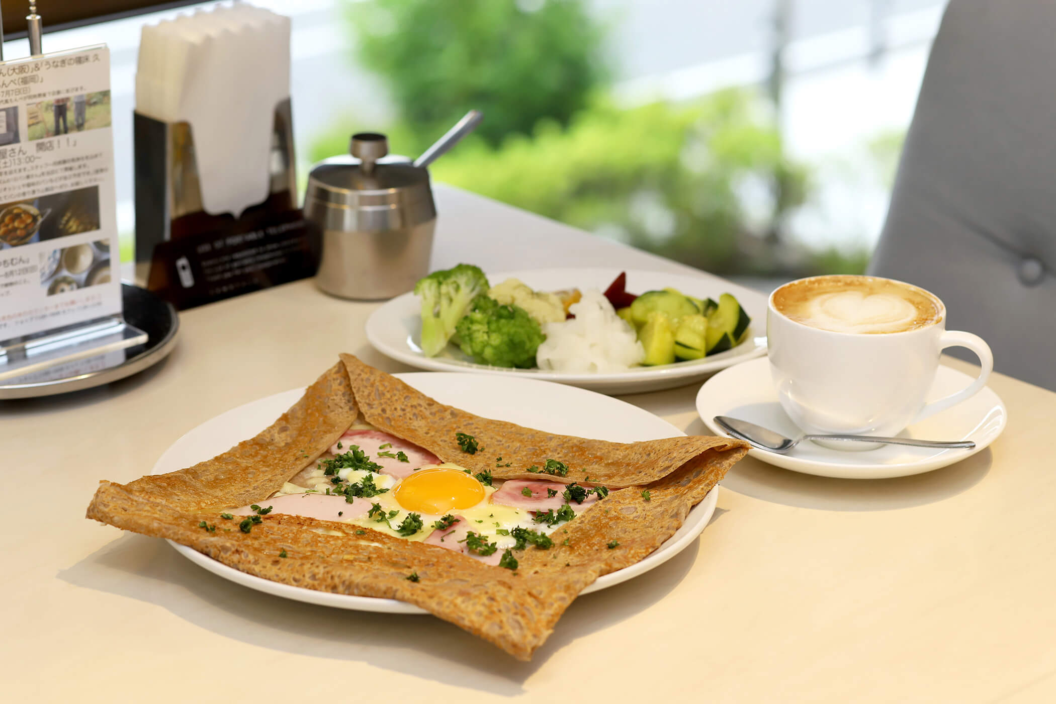 梨北産のそば粉を使ったハムのガレットは、八ヶ岳でのびのびと放し飼いされた健康な鶏の卵がとろ~り。本場フランスと同じグリュイエールチーズを使ったガレットで、濃厚でまろやかなハーモニーを奏でる。